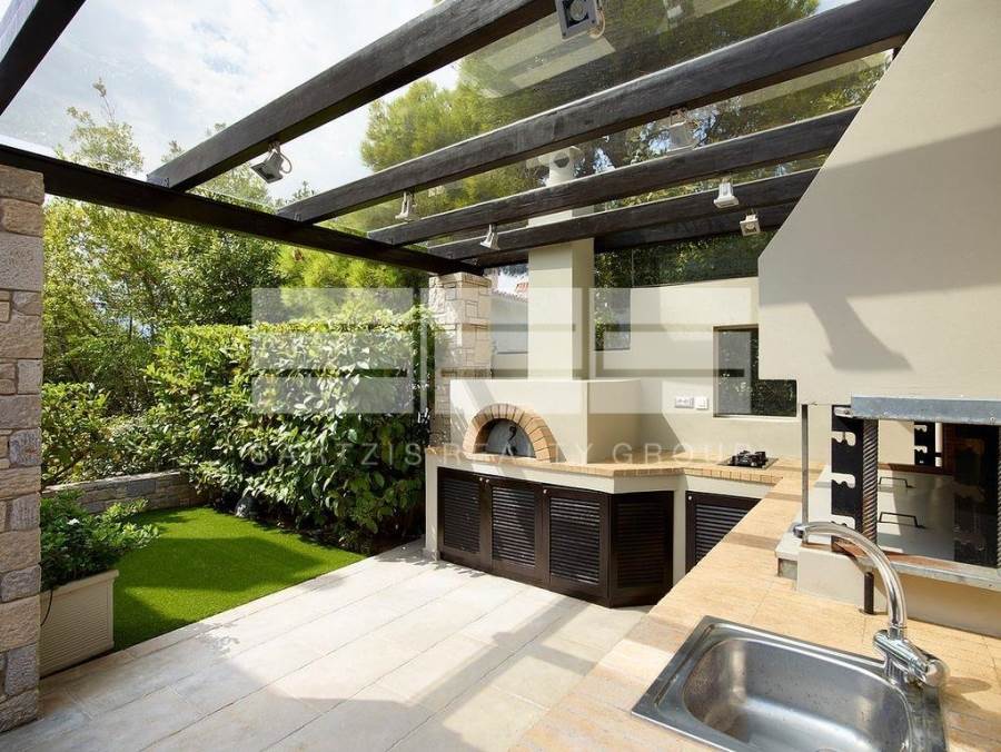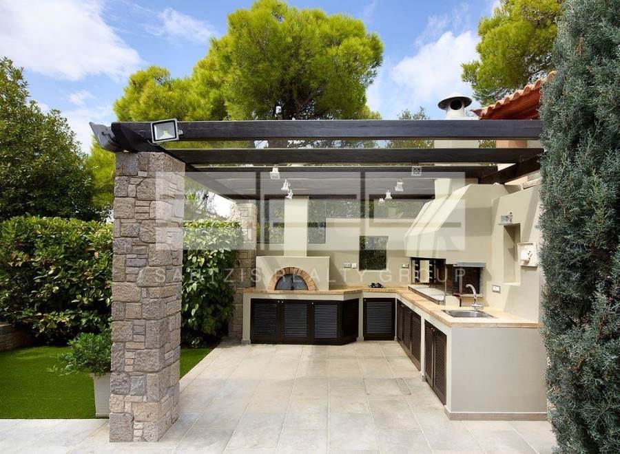 με χτιστό φούρνο, ψησταριά, εστίες γκαζιού, νεροχύτη και πέργκολα